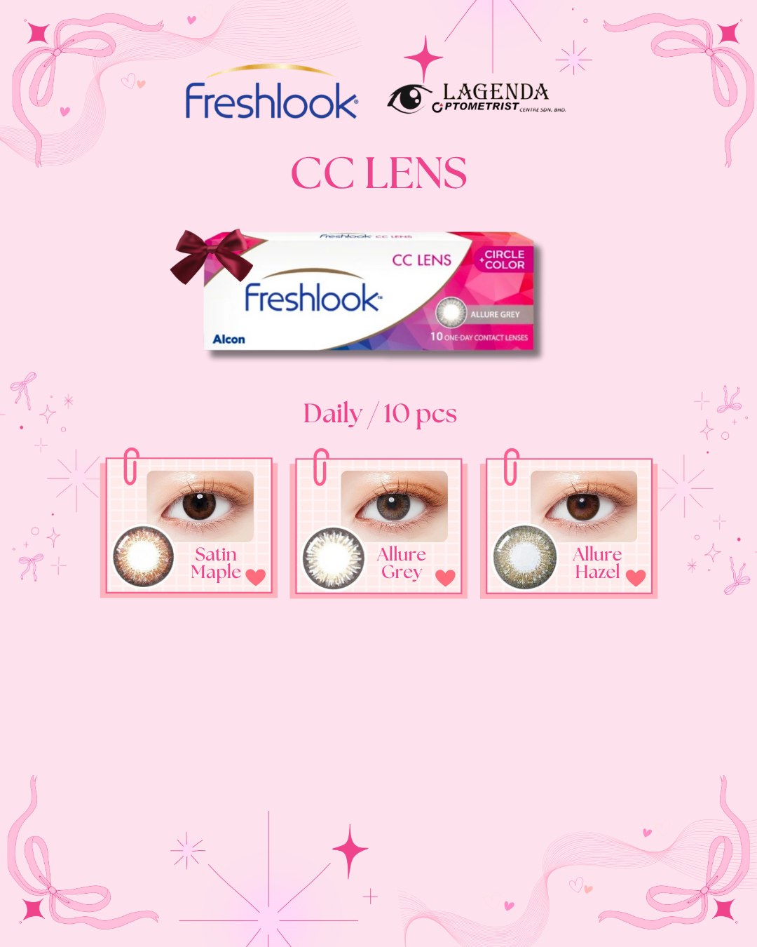 Kunjungi Lagenda Optometry untuk mendapatkan kanta lekap premium ALCON yang menawarkan penglihatan jelas dan keselesaan sepanjang hari. Sama ada anda baru pertama kali mencuba kanta lekap atau ingin menaik taraf kepada pilihan yang lebih selesa, pasukan optometris kami sedia memberi panduan profesional bagi memastikan kesesuaian terbaik untuk mata anda. Terokai rangkaian kanta lekap ALCON yang direka untuk ketahanan dan kejelasan optimum—kerana mata anda layak menerima yang terbaik.